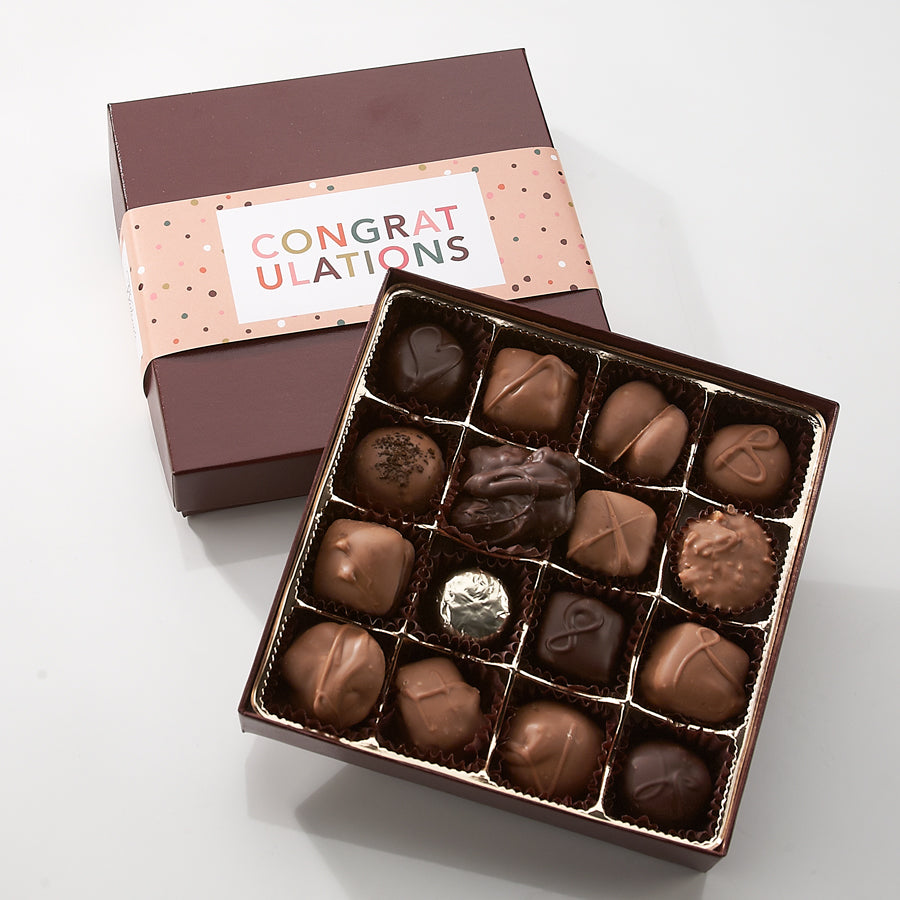 Looking for the perfect sweet gift to give during the holidays? A 16-piece chocolate assortment of our favorite chocolates; including milk and dark chocolates, nuts, creams, and caramels. It's a sweet idea!