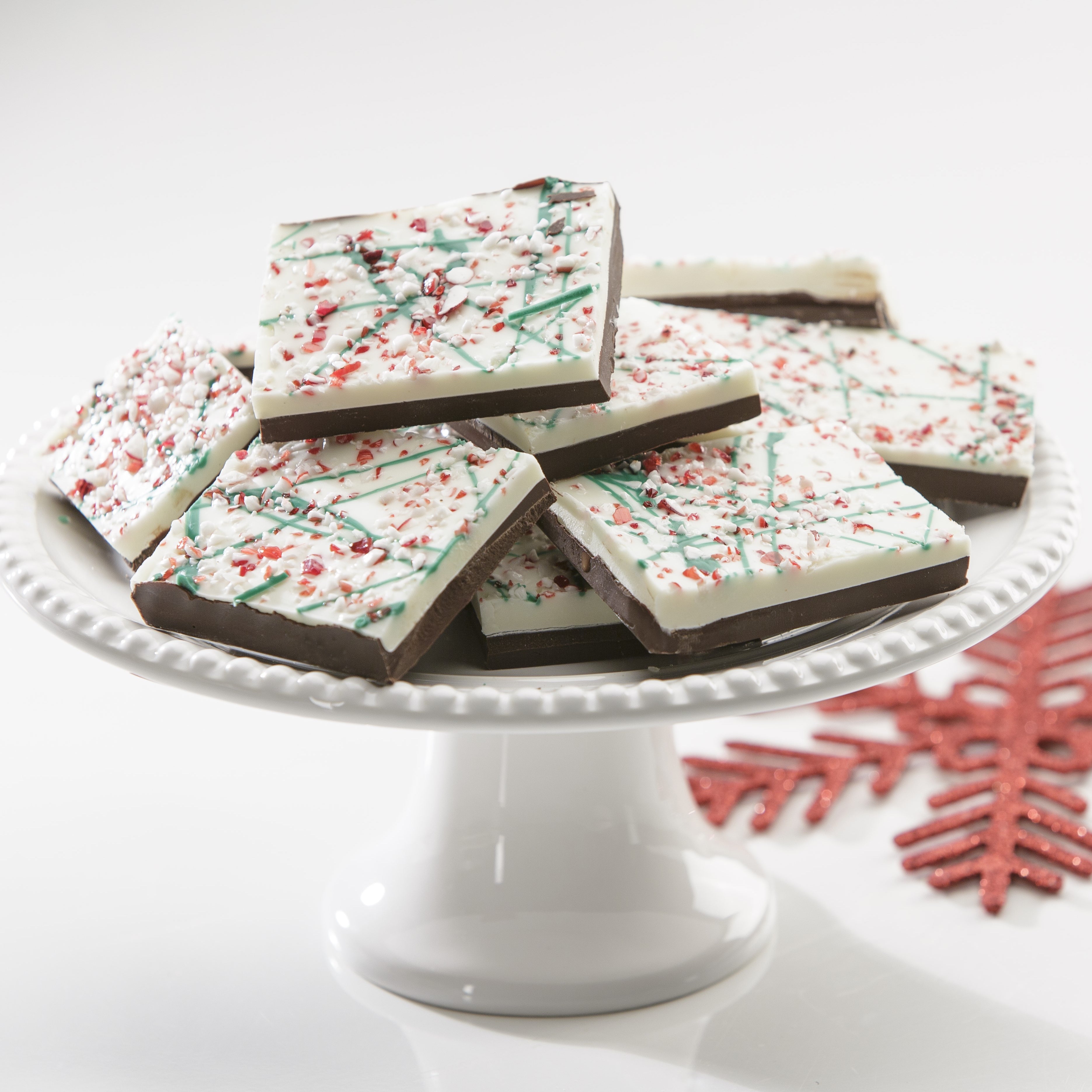 What could be more festive than alternate layers of minty dark and creamy white chocolate garnished with pieces of peppermint candy cane and latticed with a holiday-colored chocolate string? A truly unique confection for your candy dish. Net wt. 1lb. or 8 oz.