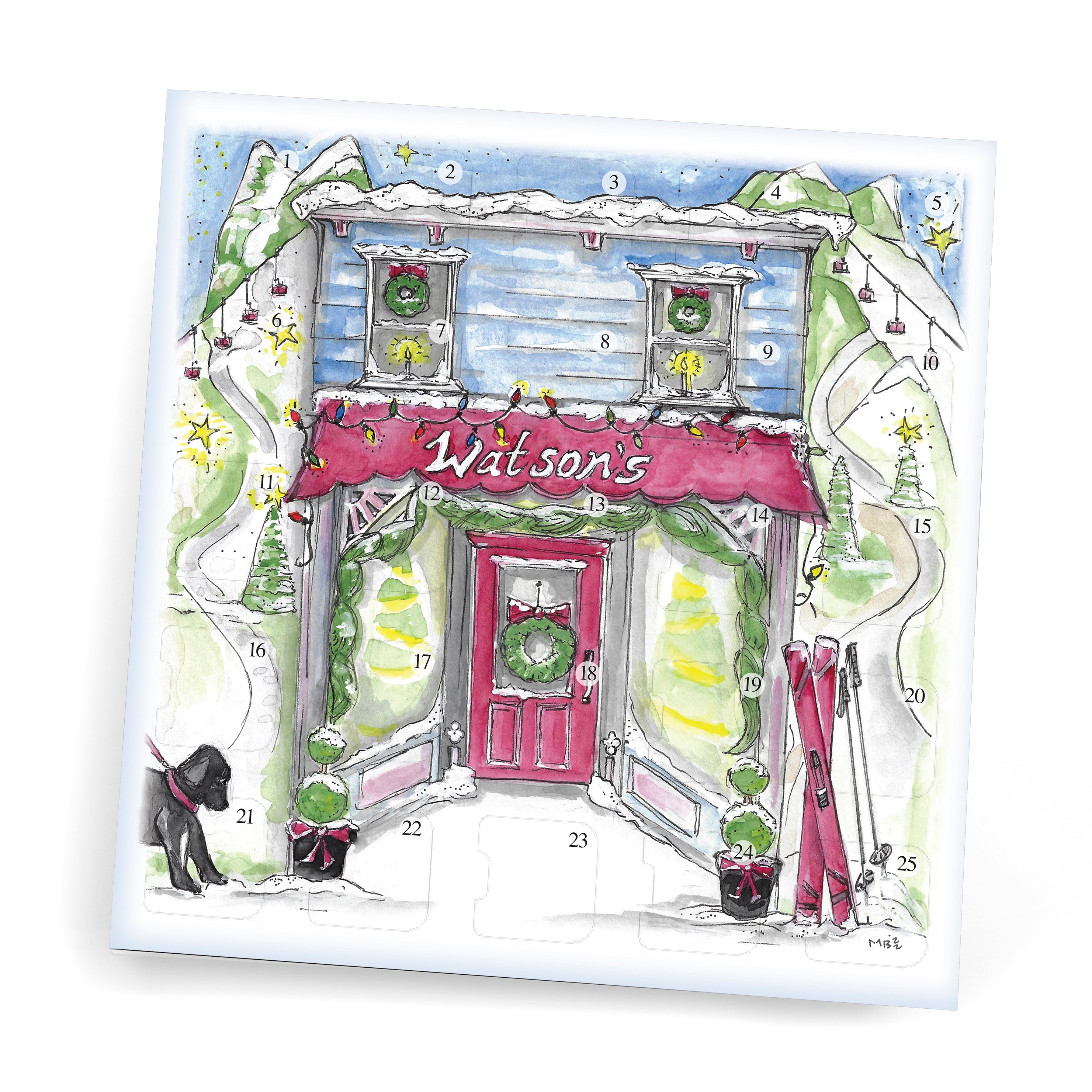 A perfect selection of Watson's chocolates to help ring in the celebration of Advent and the Christmas holiday. A heartwarming sketch of our winter wonderland shop brings warm holiday wishes to your friends and family while enjoying our deluxe assortments of milk and dark chocolate nuts, crisps, cream & chews. 25 days to delight! Net wt. 10 oz.