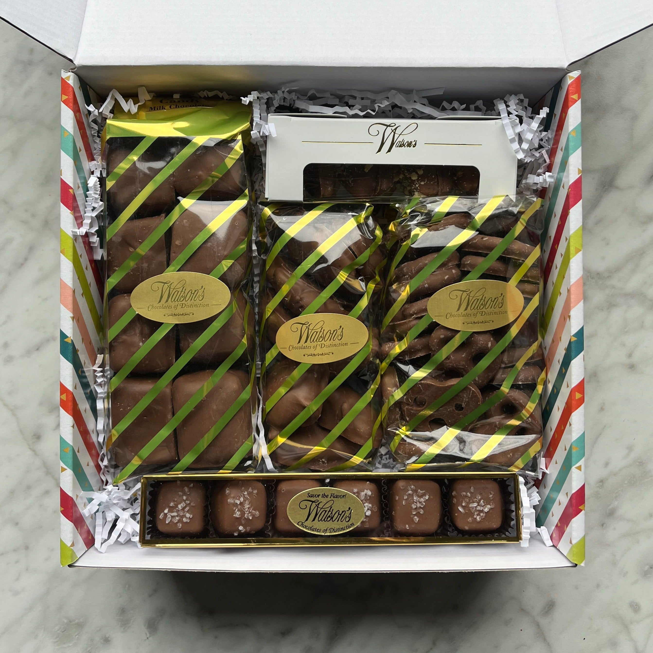 Imagine a gift box shipping right to your door with Waton's FIVE best-selling items: Buffalo's Best Sponge Candy (8oz), Chocolate Turtlettes (8oz), Chocolate Covered Cashew Buttercrunch (4oz), Sea Salt Caramels (6pc), and Chocolate Covered Pretzels (8oz). BAM!